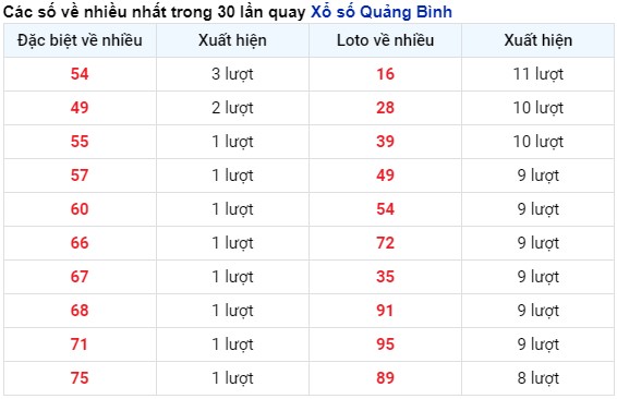 Thống kê tần suất xuất hiện kết quả xổ số Quảng Bình tính tới hôm nay